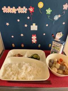 「関東煮」は、この献立は、卵の除去食です。鶏肉の旨みやじゃがいも、だいこん、にんじんなどの野菜の甘みがありそれぞれの具材にしっかりと味が染み込んでいます。