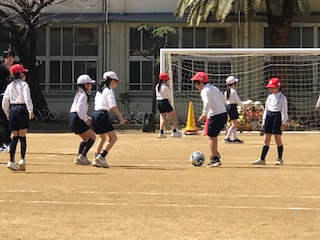 準備運動をしっかりして、サッカーのプレーです。脚と体でボールを扱うことにも慣れてきました。体やチームの動きが中学年らしく柔軟に対応しています。