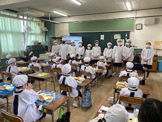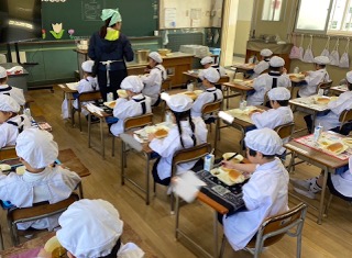 このように6年生との交流を行うことで、自然に給食の配膳や運搬の仕方覚えられます。1年生だけで給食の用意ができる日が楽しみです。