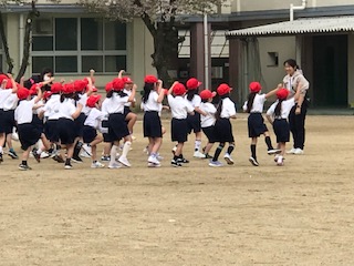 1年生が、体育で初めて運動場デビューしました!並び方を覚えて、「前にならえ」の練習もしていました。そのあとは、先生と一緒に簡単で楽しい運動や動きのまねっこゲームをしていました。先生も子どもたちも楽しく学ぶ時間でした。