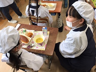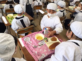 1年生の配膳がすんだら、6年生のお兄さんお姉さんは、教室の1年生の横にすわり、配膳のチェックを1年生と一緒にしていました。「スープはある?」「スプーンはここにおくよ。」など、優しく笑顔で声をかけていました。