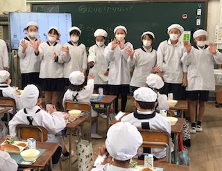 「いただきます」まえに、毎日最後には、6年生にごあいさつをして、手を振って、お別れします。ほっこり、心和む情景です。