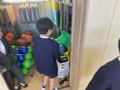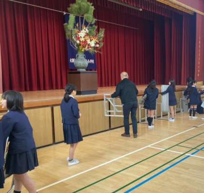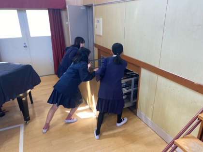 昨日の学級写真撮影後、6年生の児童が講堂の片付けをしました。
