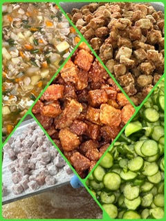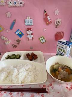 「まぐろのオーロラ煮」は、子どもたちに大人気の献立です。しょうが汁で下味をつけでんぷんをまぶして揚げています。ケチャップ、砂糖、赤みそで作ったタレをからませています。ごはんが進む一品です。