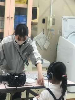 検査用のヘッドフォンを付けて、音が聞こえるか検査をします。
