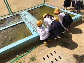 池の中のメダカや水中の藻、タニシなど、小さな生き物を見つけて先生に報告、興味津々でした。