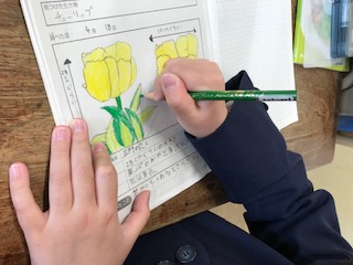 観察シートにとてもていねいに花や葉の様子を描いて、ていねに色をつけています。