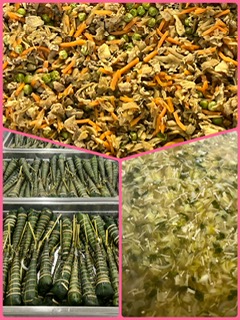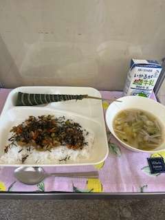 「きんぴらちらし」は、豚肉、ごぼう、にんじん、グリンピースを使用し、こんぶ(粉末)を加えて旨みをました混ぜごはんです。配食時にご飯の上に具をかけて、喫食時に混ぜ合わせます。「ちまき」は、笹の葉の香りとほんのり甘く、毎年こどもの日の行事献立で登場します。