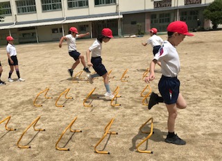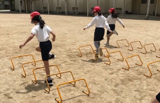 小さなハードルで、ゆっくり歩きながら、タイミングとリズムをつかんでいます。