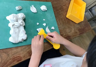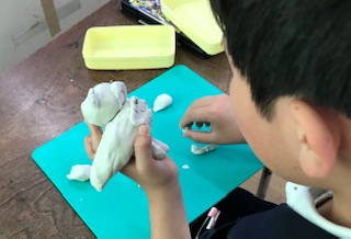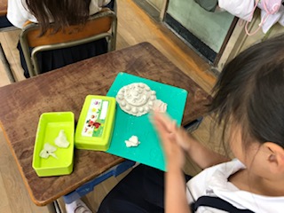 楽しみながら、作りたいものを自由に、油粘土で表現しています。丸めたり、伸ばしたり、へらで模様をつけたりなと、いろいろな表現が見られます。