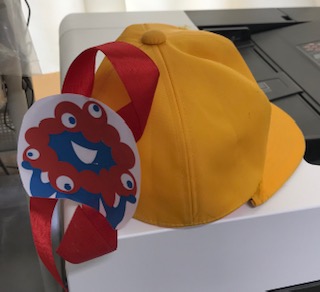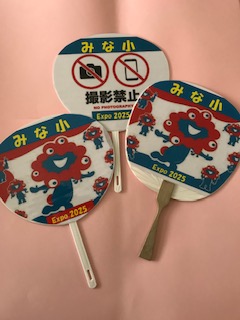 たくさんの学校が訪れる万博で迷子にならないように、教員が考えた飾りや目印を帽子につけて現地へ向かいます。帽子をかぶっていれば、人混みでも教員が子どもを見つけることができます。また、子ども達からも先生の居場所がしっかりわかるように、学校で手作りした「万博うちわ」を引率者は持っています。