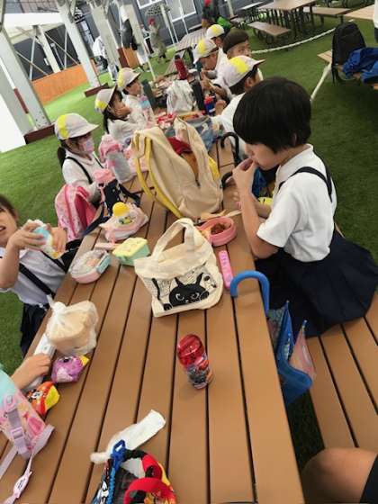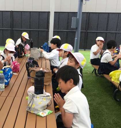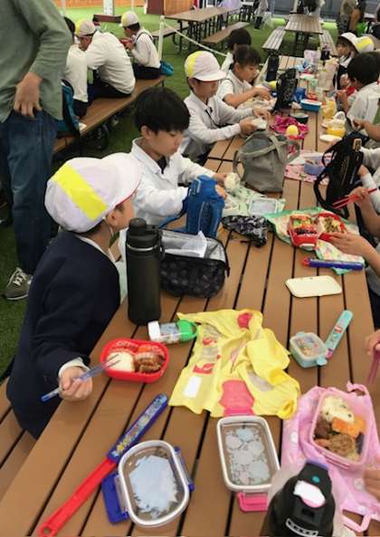 待ちに待ったお弁当タイムです。お弁当を作ってくれたお家の人に感謝して「いただきます!!」