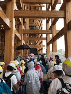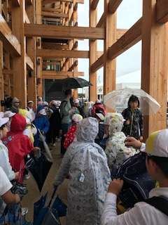 うわさの「大屋根リング」の下を歩きました。子ども達は、大きな柱の交差に心を動かされているようでした。
