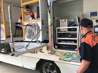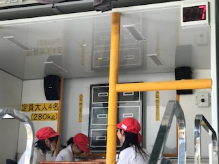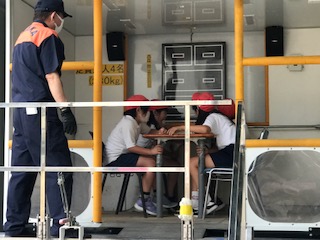 消防署からは起震車が来ています。弱い揺れから震度7まで、3年以上の児童が体験しました。ものすごい揺れにテーブルをつかみ、絶叫する様子も見られました。