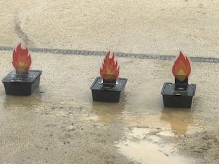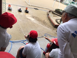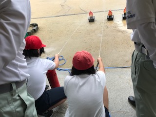 水が出る消火器を使って、消火器の使い方と初期消火の訓練を行いました。消火器を使う手順を教えてもらい、狙いを定めて噴射!目の前の炎の絵が今日の的です。