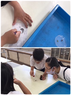 発芽前と発芽後、2種類の種子の断面にヨウ素溶液をかけて変化を観察していました。