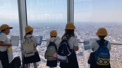 3年生の児童は、大阪市の様子をよく観察しています。床がガラス張りのところがありましたが、怖がらずに座っている児童もいました。