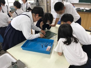 注意してホウセンカの部分を切り取り、切り口をルーペで観察しました。水が根から管を通っては運ばれていることがわかりました。観察したことはノートにも記録しています。