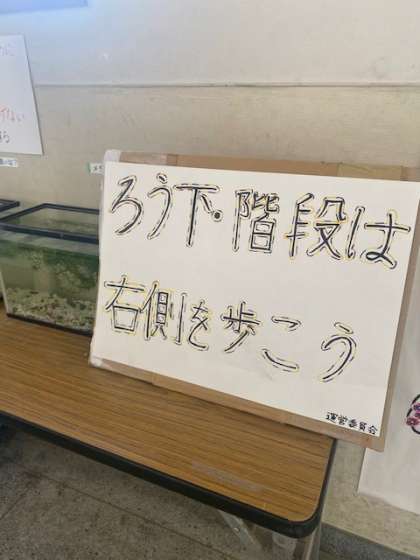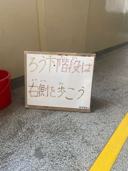 話し合いをもとに、みんなが目に留まりやすい廊下に、写真のような啓発物を置きました。長吉南小学校のみんなが、「廊下・階段は右側を歩く」という決まりを守ることができたらいいですね。