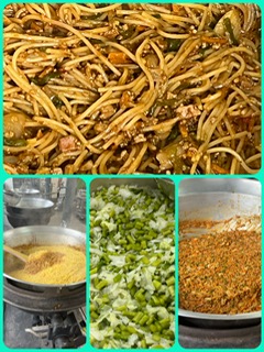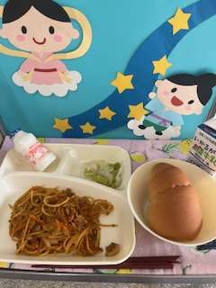 「カレースパゲッティ」は、豚ひき肉を主材に、ベーコンで旨みを増し、カレールゥの素などで味付けしたスパゲッティです。パンによくあう献立です。