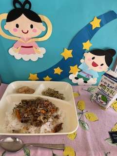 「牛丼」は、子どもたちに人気の献立で、牛肉、糸こんにゃく、玉ねぎ、にんじん、えのきをいため煮にし、甘辛く味付けしています。
