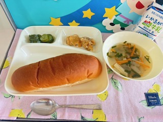 「鶏肉のからあげ」は、鶏肉に、しょうが汁、にんにくなどで下味をつけ、でん粉をまぶして揚げています。カラッと揚がっていて食べ応えのあるからあげです。
