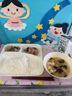 1学期最後の給食、みんな元気いっぱいの挨拶が、児童だまりに響きわたっていました。