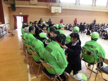 約30名の見守り隊の方にお越しいただきました。子ども達から感謝の気持ちを込めた首飾りや大きな感謝状を差し上げました。
