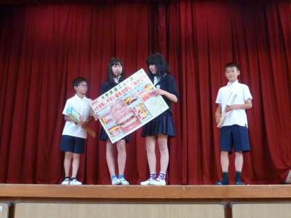 児童集会のときに保健委員会より歯のみがき方についてお知らせをしました。はじめての発表でしたが、歯ブラシの実演も上手にできました。