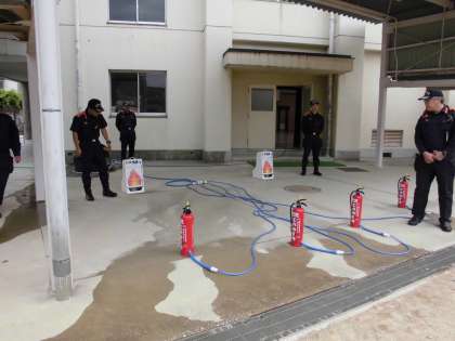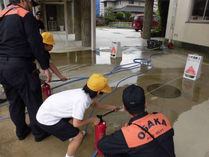 避難訓練の後、5・6年生は水消火器を使った消火器体験を行いました。当初は各学級から5名だけが代表して体験することになっていましたが、全員が体験することができました。