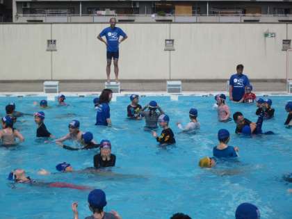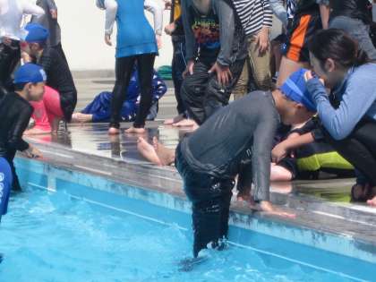 水難事故についてのお話の後、長袖・長ズボンを着用して水に入り、イルカジャンプやクロールをしました。水着だけの時よりも体が重く感じられ、とても動きにくそうにしていました。