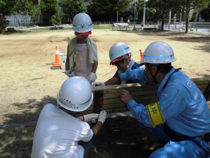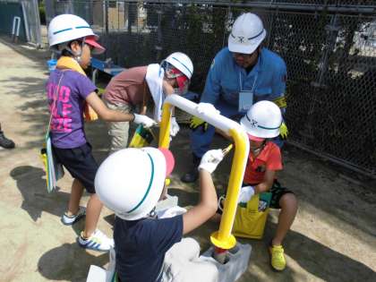 7月14日(木)、長吉東部中央公園で、3年生の子ども達が長居公園事務所の方と一緒に公園点検を行いました。全員ヘルメットと軍手を着用して、長居公園事務所の方に教えていただきながら『遊具の点検』『車止めのペンキ塗り』『ベンチのネジ締め』等の作業を行いました。