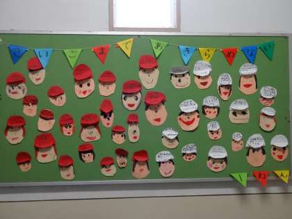 天候が不順ですが、子どもたちは、毎日運動会に向け頑張っています。運動会のそれぞれのめあてを記入した帽子をかぶった顔をつくりました。1年の階段に掲示しています。