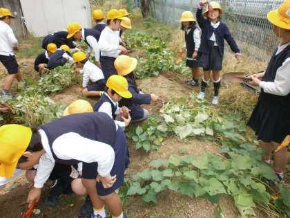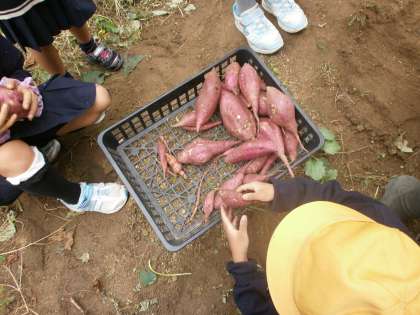 10月28日(金)に2年生は、はぐくみ農園にておいもほりをしました。今年5月に苗を植え、夏場には蚊にさされながら草ぬきをみんなで頑張りました。世話の甲斐あり、大きなおいもさんがごろごろ収穫できました。土の中から出てくるお芋さんに子どもたちは、あちらこちらで歓声をあげていました。