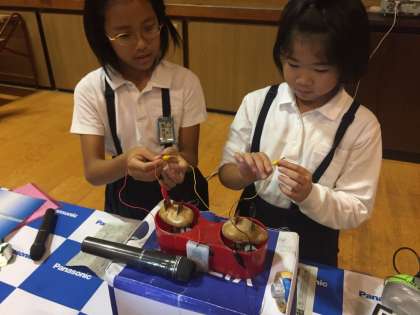 パナソニックから末次先生に来ていただき、1時間目は電池の種類や仕組みについてお話をしてもらいました。