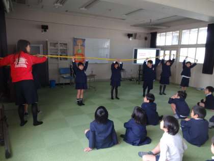 食べ物が口から入って、排泄されるまでを具体的に教えてもらいました。小腸の長さをみんなで体感したり、大腸の長さを身長と比べたりしてその長さにびっくりしました。