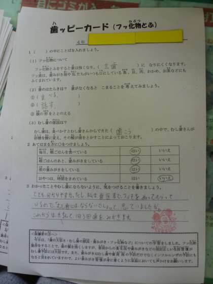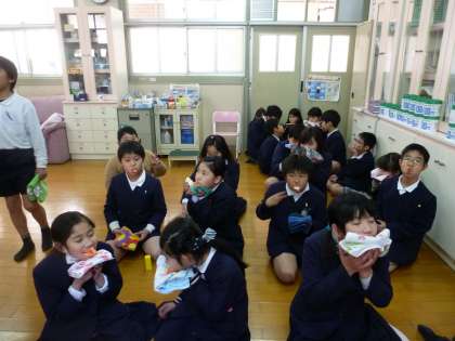 フッ素化塗布した後は、口に入れたままの状態で3分間待ちます。よごれないようにタオルをあごに・・・。「3分がこんなに長いなんて!」と実感しました。砂時計で3分を待ちます。終わっても・・・お茶をのんだりうがいをしたりはできません。よくがんばりました。