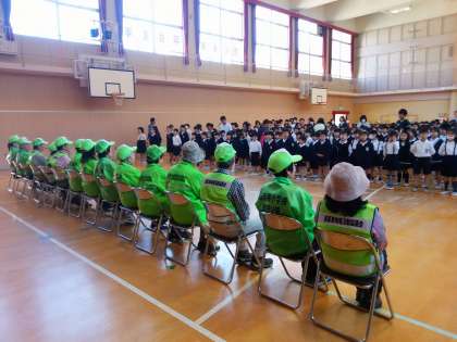 4月24日(月)に、普段から子どもたちの安全を見守っていただいている見守り隊の方々に、学校に来ていただき、見守り隊はじめの会を開催しました。お忙しい中、学校に来ていただけた15名もの見守り隊の方に直接「この1年間、よろしくお願いいたします」という挨拶と校歌のプレゼントをすることができました。