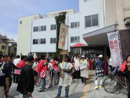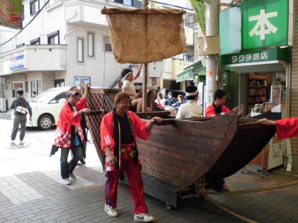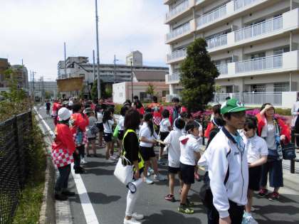 赤留比賣を乗せた輿や古代船を、長吉南小学校からクラフトパークまで、長吉東小学校・長原小学校・長吉南小学校の子どもたちが曳航しました。