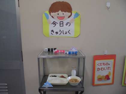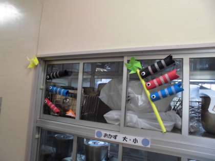 親子方式給食の導入によって、5人の給食調理員さんが毎日約800人分の給食を調理してくださっています。その忙しい作業の合間を見つけては、子どもたちが給食に興味を持ち、毎日楽しくおいしく給食が食べられるように、給食室の中をいろいろな手づくりの作品で飾ってくれています。