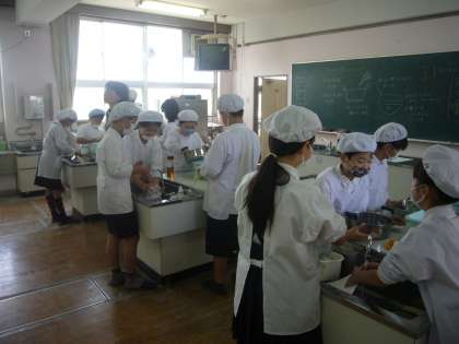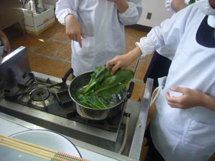 5年生の調理実習第2弾です。今回は「ほうれん草のおひたし」にチャレンジしました。生のほうれん草とくらべると、ゆがくことで色も鮮やかになったり、かさも減ったりする変化を実感することができました。きれいに洗って、根元の方も食べている子どもから「甘くておいしい!」や「根元の方が甘い」といった声もあがっていました。調理実習2回目とあって、どの班も手際よく行うことができていました。