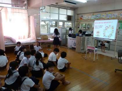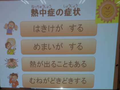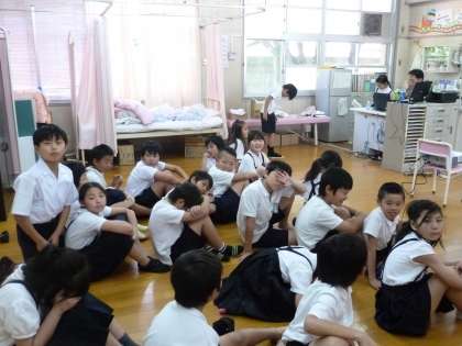 最近は暑い日が続き、体調をくずし保健室に来室する児童も増えました。これからの暑さ対策もかねて熱中症予防を話しました。みんなよく知っていました。水分補給、ぼうしをかぶる、あせをふく、ひかげで休む、栄養をとる、すいみんが大事など。暑さに負けない体力をつけましょう!