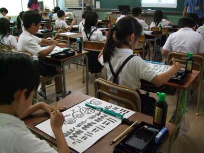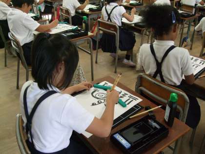 3年生は、6月6日(火)にはじめての習字(毛筆)の学習をしました。習字の心構えからはじめ、道具の置き方や筆の使い方の説明を聞いた後、まずは、筆を使って線の練習をしました。そのあと、「一」にチャレンジ。みんな真剣な表情で筆をゆっくりと動かして書いていました。思いのほか、服も汚すことなく、とても集中して学習に取り組んでいました。