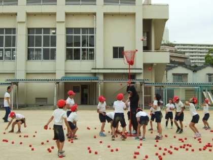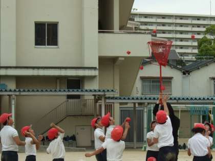 2競技目は、玉入れ。運動会では1年生の定番種目ですが、3・4年生でも十分盛りあがりました。途中から応援合戦が始まるほど、子どもたちは、必死になって競技に取り組んでいました。