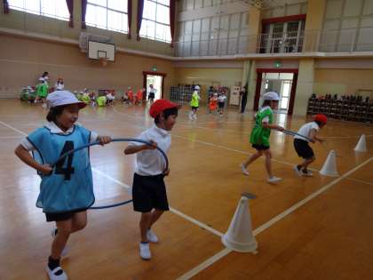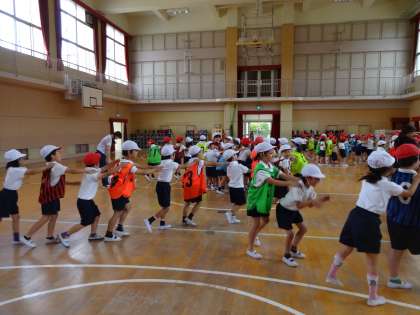 1年生と2年生のペアでリレーをしたり、爆弾ゲームをしたり、じゃんけん列車をしたりしました。協力しあって、楽しくゲームをし、盛りあがりました。