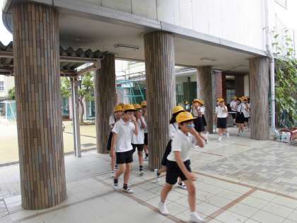 6月7日(水)の2時間目に『給食室から出火した』との想定での避難訓練を実施しました。普段は運動場に避難するのですが、雨天のため講堂に避難しました。
