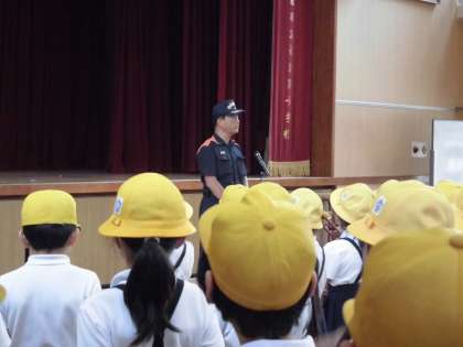 避難開始から避難完了まで4分18秒で、平野消防署の方から「大きな声で喋っている人もなく、先生の指示をしっかり聞いてきちんと避難できていました」とお褒めの言葉をいただくことができました。また、「火遊びの恐ろしさ」や「地震が発生した時の心構えや第一次避難のしかた」「プールでの安全」等についての話をしていただきました。