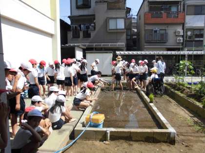 はじめての田んぼの足の感触に、歓声とも悲鳴ともとれる声をあげながら、よちよちと田んぼの中を歩き、何とか田植えを体験することができました。田んぼの土に足をとられて倒れそうになる子どもや、恐々とへっぴり腰になってしまう子どももおり、笑い声も加わった楽しい田植えになりました。