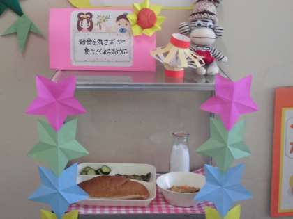 給食調理員さんたちは、「給食を残さず 食べてくれますように」と、みなさんの健康や成長につながるようなお願いをしてくれています。