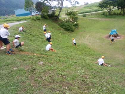 昼食後の自由時間では、子どもたちは坂すべりに夢中でした。